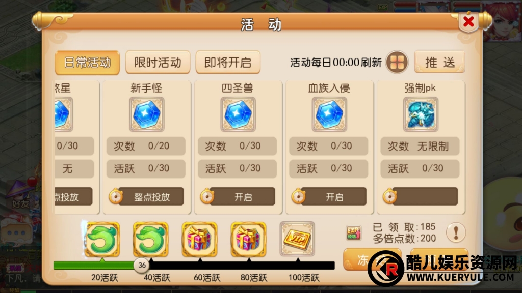 小资玩法:充值666元,开区当天双倍充值,实际到账1998平台币,可在后台购买888平台币宠物。充值1288元,可获得7个累积礼包(赠送1.55成长小夫子一只)